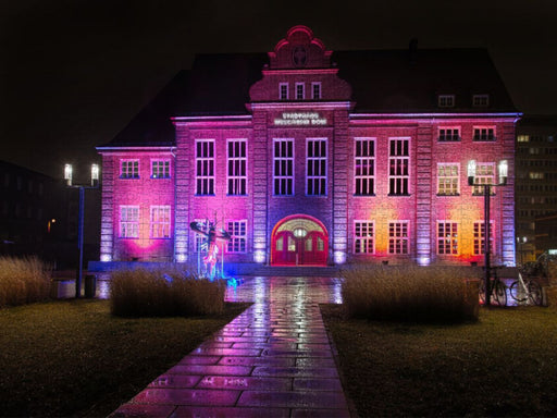 Das zentral gelegene Cottbuser Stadthaus mit dem Krebs als Wappen und bunter Illumination. Neben wichtigen Pressekonferenzen und kultureller Vera...