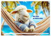 August: Schaf im Liegestuhl am Strand mit Cocktail