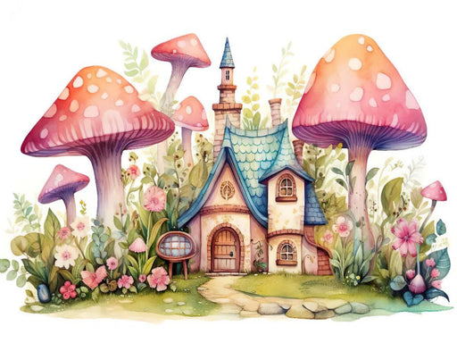 Tauchen Sie ein in die magische Welt der Feen mit unserer bezaubernden Aquarellzeichnung eines lustigen kleinen Feenhauses! Dieses farbenfrohe Ku...