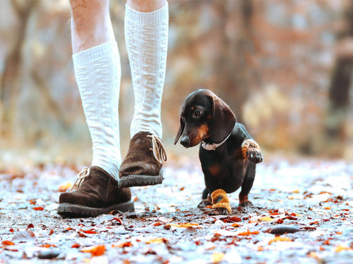 Die Glatthaar-Dackelhündin Bibi vom Tatzelwurm macht Pfötchen hoch mit ihrem Besitzer Ein Motiv aus dem Kalender "Typisch Dackel 2021" von Anja Fo...