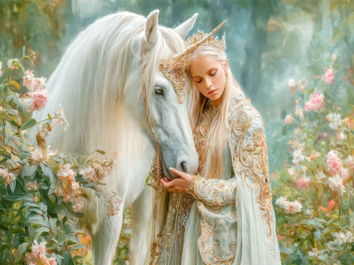 Prinzessin mit Einhorn im Garten Tauche ein in ki-generierte Welten, verträumt und märchenhaft in zarten Farben. Entdecke zauberhafte Motive. Für ...