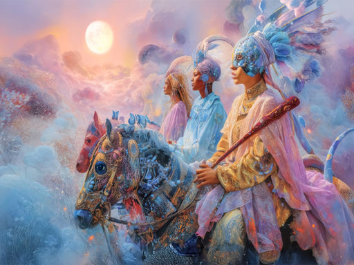 Auf Pferden in der Abendröte unterwegs Gezeigt werden kreative malerische Werke von märchenhaften Geschichten. Eine träumerische Farbpalette verle...