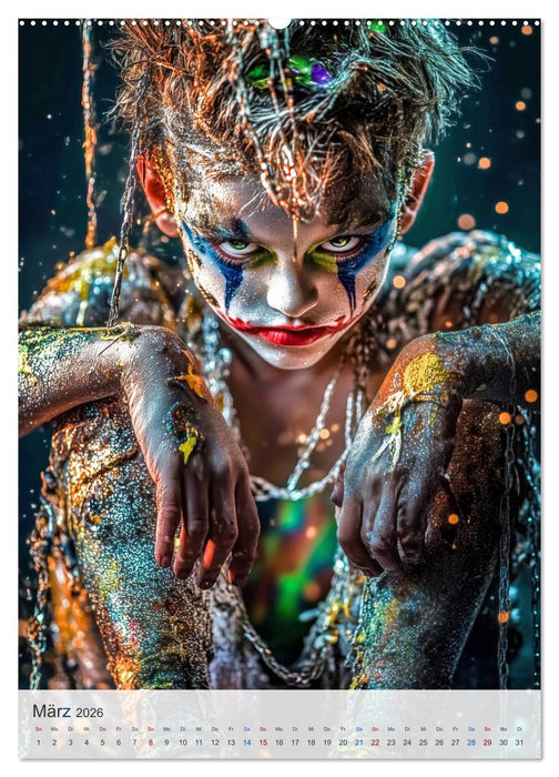 Die Spuky Clowns sind zurück. Und sie haben dein Ticket schon in der Hand. Keine Vorstellung gleicht der anderen. Kein Ausgang garantiert. Kein Gesicht, das du je vergessen wirst. Buch jetzt dein Ticket ins Grauen. Denn im Zirkus der Spuky Clowns, lacht niemand zum Schluss. Alle hier gezeigten Bilder wurden mit Sorgfalt, Liebe und mit Hilfe einer KI generiert. Abschließend werden sie mit Bildbearbeitungsprogrammen überarbeitet und in den Kalender eingefügt.