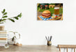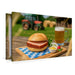 Premium Textil-Leinwand Leberkässemmel mit Bier und Senf auf bayerischem Holztisch