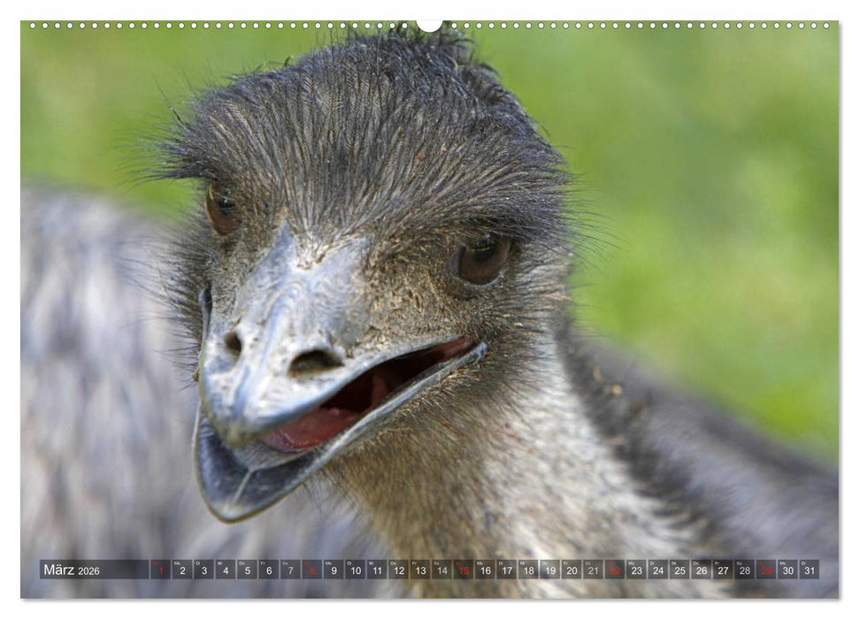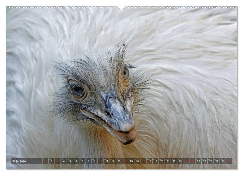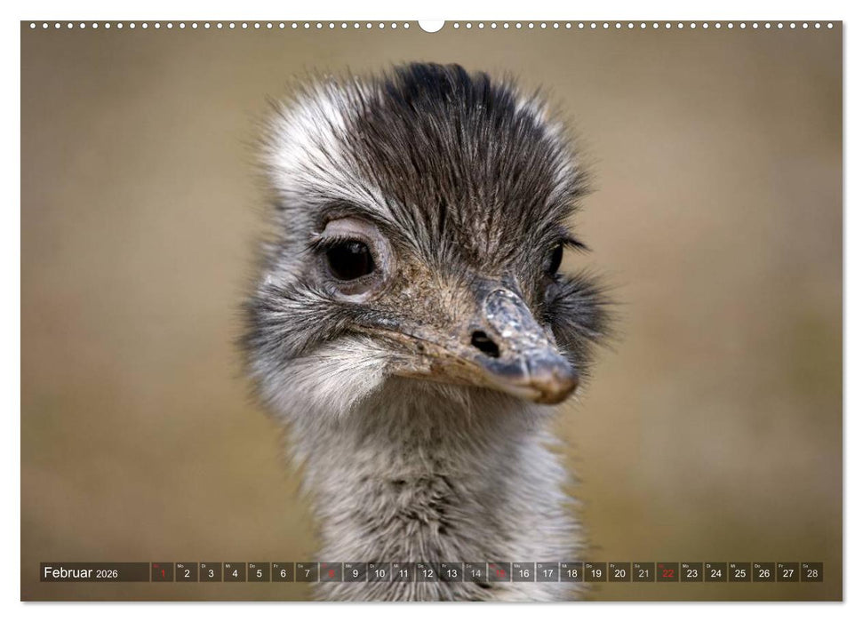 zeigt ausfrucksvolle Porträtfotos von Afrikanischen Straußen, Helmkasuaren, Nandus und Emus.