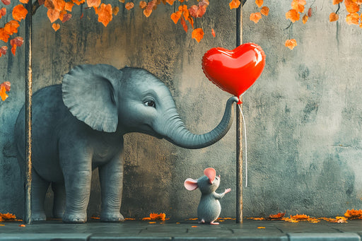 Ein Bild voller Magie, Freundschaft und Abenteuer! Der Elefant und die Maus machen sich gemeinsam mit einem leuchtend roten Luftballon auf den We...