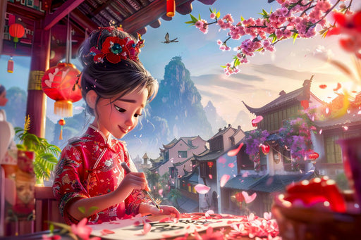 Ein Mädchen konzentriert sich auf die kunstvolle Kunst der chinesischen Kalligrafie. Mit ruhiger Hand zeichnet ein Mädchen kunstvolle Schriftzeich...
