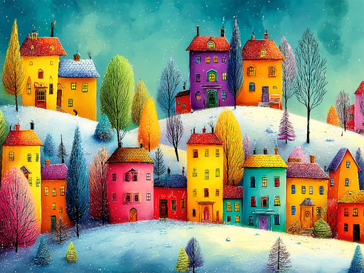 Eine farbenfrohe Winterlandschaft mit bunten Häusern und verschneiten Bäumen sorgt für Freude, Gemütlichkeit und stimmungsvolle Dekoration. Leucht...