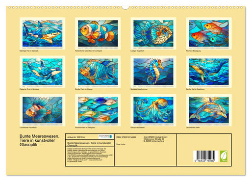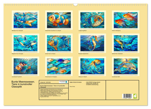 Buntglasdarstellungen von Meereslebewesen in leuchtenden Farben (Monatskalender, 14 Seiten) Dieser Kalender zeigt die Eleganz schöner Buntglaskuns...