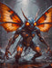Das Portrait zeigt ein erschreckendes Mischwesen aus Mensch und Motte, dessen menschliches Gesicht von abnormen, filzigen Flügeln umrahmt wird, die in einem blassen, geisterhaften Schimmer leuchten. Die Augen des Wesens sind riesig und glühend, während ein Hauch von Verfall und Dunkelheit das Bild umgibt, als ob die düstere Atmosphäre die Seele des Betrachters zu verschlingen droht.