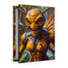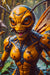 Das Portrait zeigt ein groteskes Mischwesen, dessen Gesicht eine entstellte Mischung aus menschlichen Zügen und hornissenartigen Merkmalen ist: glühende Facettenaugen ersetzen die menschlichen, und ein schwarzer, glänzender Chitinpanzer zieht sich über die deformierte Haut. Aus dem Mund ragt ein scharfer, tödlicher Stachel, während die düstere Atmosphäre durch dramatisches Schattenlicht und einen Hintergrund aus bedrohlich verzerrten Flügelspiegelungen verstärkt wird.