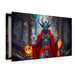 Eshu ist der trickreiche Götterbote der Yoruba, ein dynamischer, zwiespältiger Charakter mit einem schelmischen Lächeln. Er trägt farbenfrohe, asymmetrische Kleidung, einen spitzen Hut und hält einen zeremoniellen Stab, während um ihn herum zwei Wege verlaufen – Symbol seiner Rolle als Hüter der Wege und Entscheidungen. Umgeben von verwirrenden Masken und flimmernder Energie ist seine Präsenz zugleich verspielt und respektgebietend.
