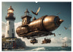 Januar: Weißer Leuchtturm - Steampunk Flugerät beim Abflug