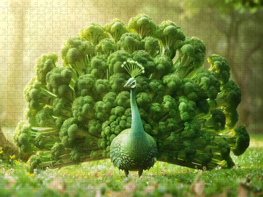 Grün. Stolz. Gemüsekunst. Der Brokkolipfau macht einen gesunden Eindruck. Er war monatelang unterwegs. Schlug sich durch Kürbisdickichte, tarnte s...