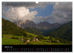 The calendar shows photos of the alps. It shows the variety of the alpine landscape from rolling hills in Tyrol, Salzburg, Carinthia, Vorarlberg and Styria in Austria to the steep rocky peaks in Switzerland and the dolomites in northern Italy.