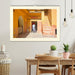 July: Woman in a red sari in front of a blue house