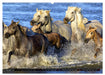 Februar: Camargue-Pferde galoppieren durchs schäumende Wasser