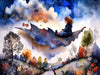 Auf einem Blatt im Herbstwind umhergetragen werden und die Welt von oben bestaunen… Welches Kind träumt nicht davon? Erfreuen Sie sich an diesem KI-Bild eines wahrgewordenen Kindertraums.