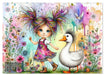 März: Ein lustiges Mädchen mit bunten Haar und lustigen Kleidern tanzt mit einer weißen Gans