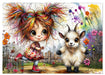 September: Ein drolliges Mädchen mit bunten Zöpfen und lustigen Kleidern tanzt vorsichtig mit einem kleinen Vogel