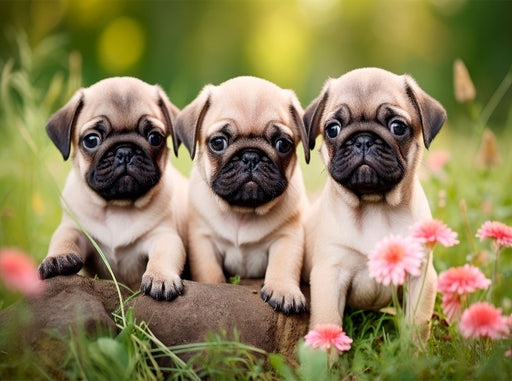 Tapsige Freunde Drei kleine Mops-Welpen in Reih und Glied und jedes schaut, als hätte es gerade die wichtigste Blume im Garten entdeckt. Mit ihren...