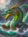 Ryujin erscheint als majestätischer, schlangenartiger Drache mit smaragdgrünen Schuppen und leuchtenden, goldenen Augen. Seine gewaltigen Klauen greifen nach den Wellen, während er aus dem tosenden Ozean auftaucht, sein langer Körper von schimmernden Perlen geschmückt. Wasserstrudel und leuchtende Blasen umgeben ihn, während sein mächtiges Gebrüll die Stürme beherrscht.