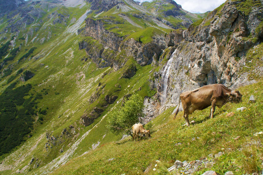 Am Hang vor dem Wasserfall Tauche ein in die Welt der Bergkühe. Auf diesem einzigartigen Puzzle siehst du zwei ausdauernde Kühe, die vor einem wun...
