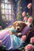 Sanft und verträumt liegt der kleine Hundewelpe in einer Welt aus Rosenblüten. Dornröschens Zauber wird hier mit der Zartheit eines Tieres verbunden – eine märchenhafte Szene, die Ruhe, Schönheit und Fantasie ausstrahlt.