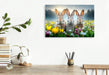Premium Textil-Leinwand Drei Hasen genießen die ersten warmen Sonnenstrahlen auf einer bunten Blumenwiese