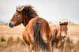- Exmoor Pferde, Stute und Fohlen stehen gemeinsam im Wind im trockenen Steppengras von Autor(in): Fotografie Sabine Aichberger