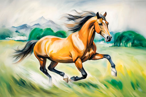 Ein majestätisches braunes Pferd galoppiert über eine grüne Wiese im Stil des Realismus Dieses beeindruckende Motiv aus dem Kalender „Jahr des Pfe...