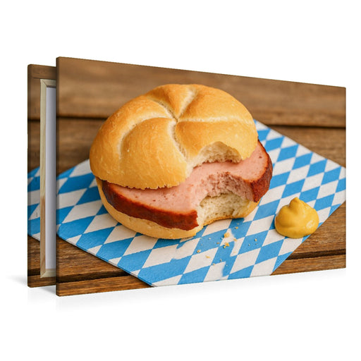 View full detailsPremium Textil-Leinwand Angebissene Leberkässemmel mit Leberkas und Senf