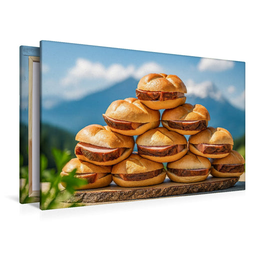 View full detailsPremium Textil-Leinwand Bayerische Leberkässemmeln vor Alpenpanorama