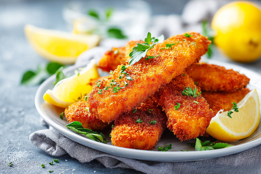 Ein appetitliches Motiv, das goldbraune, knusprige Fischstäbchen mit Petersilie und frischen Zitronenspalten zeigt. Ideal als Wandbild. Dieses Bil...