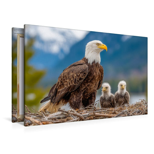 Premium Textil-Leinwand Weißkopfseeadler mit Jungvögeln im Nest vor Bergkulisse