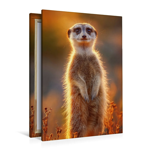 View full detailsPremium Textil-Leinwand Erdmännchen steht im Sonnenuntergang und blickt neugierig