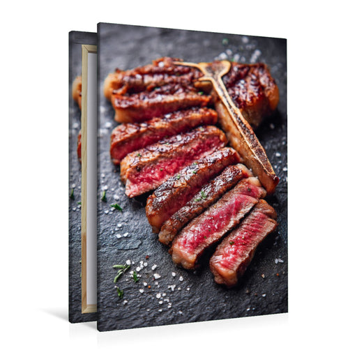 View full detailsPremium Textil-Leinwand Saftiges T-Bone-Steak in Scheiben mit grobem Salz