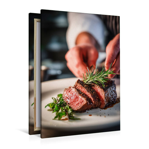 View full detailsPremium Textil-Leinwand Zartes Steak wird kunstvoll mit frischen Kräutern angerichtet