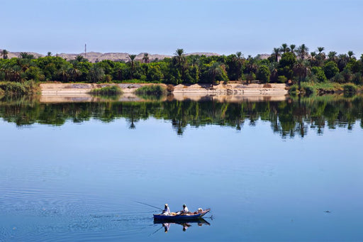 Nilromantik – Boot vor grüner Oase Erlebe Ägypten aus einer neuen Perspektive: Ein kleines, traditionelles Fischerboot gleitet ruhig über den Nil ...