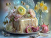 Ein Bild voller Lebensfreude: Cremige Torte mit floraler Krone aus Rosen, Ranunkeln und Osterglocken, flankiert von exotischen Früchten wie Drachenfrucht und Passionsfrucht. Die silberne Platte, das edle Besteck und die leuchtenden Narzissen in der Vase runden das Arrangement ab. Dieses Motiv ist ein Fest für die Augen – als Puzzle voller Entdeckungen oder als Wandbild mit kulinarischer Eleganz.