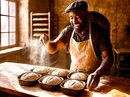 Von der Freude, im Bäckerhandwerk zu arbeiten Dieses atmosphärische Bild sprüht vor Lebensfreude, Handwerkskunst und Wärme: Ein Bäcker bei der Arb...
