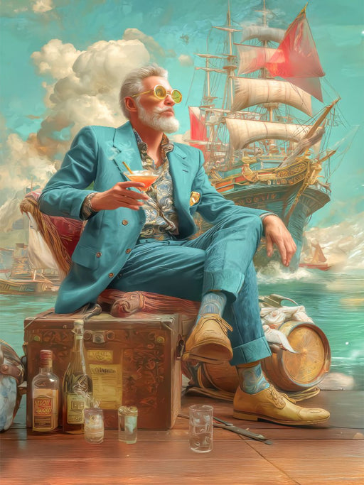 Ein Drink und die Jacht im Hintergrund Erleben Sie KI-generierte Kunstwerke mit dem Thema Superreich. Gediegene Gentlemen und Ladies genießen ihre...