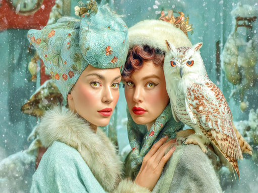 Winterliche Stimmung Erleben Sie ki-generierte Kunstwerke im leicht surreal Stil. Dandyhafte Gentlemen und Ladies mit einer orange-türkisfarbenen ...