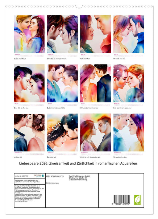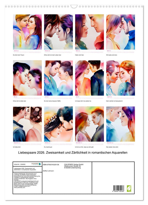 View full detailsLiebespaare 2026. Zweisamkeit und Zärtlichkeit in romantischen Aquarellen (CALVENDO Premium Wandkalender 2026)