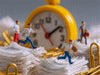 Miniatur-Angestellte hetzen über Aktenstapel, begleitet vom stummen Takt einer überdimensionalen Uhr. Die detailreiche, KI-generierte Szene bringt den absurden Beschleunigungsdrang des modernen Büroalltags pointiert auf den Punkt. Eine visuelle Satire auf Zeitdruck, Effizienzwahn und das endlose Rennen im Kreis.