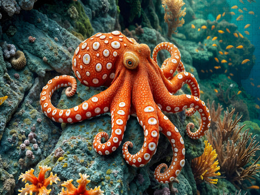Tauchen Sie ein in die faszinierende Unterwasserwelt! Dieser orangefarbene Oktopus mit seinen einzigartigen weißen Mustern zieht alle Blicke auf ...