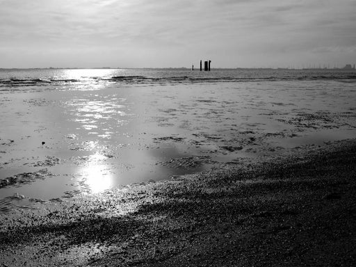Schwarzweiß Foto, Die Sonne reflektiert sich im Wattenmeer Der Fotograf Rolf Pötsch vermittelt mit seinem Schwarzweiß Foto Sonnenstrahlen im Watte...