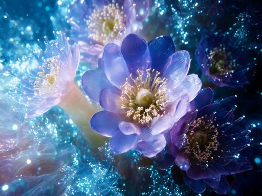 Wo Biologie und KI verschmelzen Filigrane Anemonen wachsen aus lichtdurchfluteten Kristallformen. Die KI-Generierung betont Transparenz, Tiefe und...