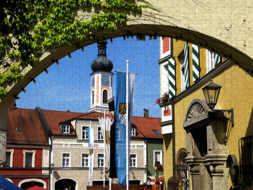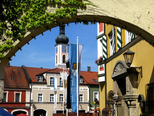 Blick durch Torbogen auf den Stadtplatz Ein Motiv aus dem Kalender Drachenstadt Furth im Wald / Renate Bleicher: Umrahmt von den Bayerwald-Bergen ...