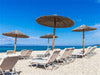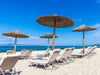 Sonnenliegen und Strohdächer am Strand von Kassandra